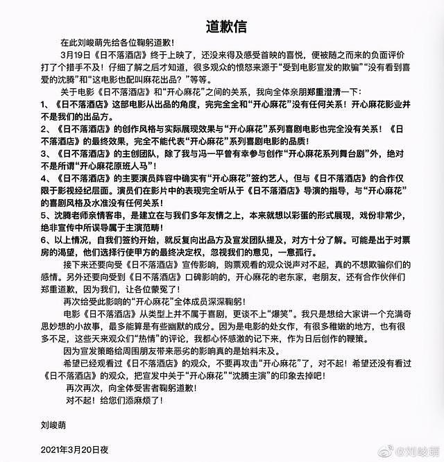 他总算在道歉信里说了句实话,说:“虽然影片中有开心麻花的签约艺人,但与他们与《日不落酒店》的合作仅限于影视经纪层面,演员们在影片中的表现完全听从于《日不落酒店》导演的指导,与开心麻花的喜剧风格和水准没有任何关系。”