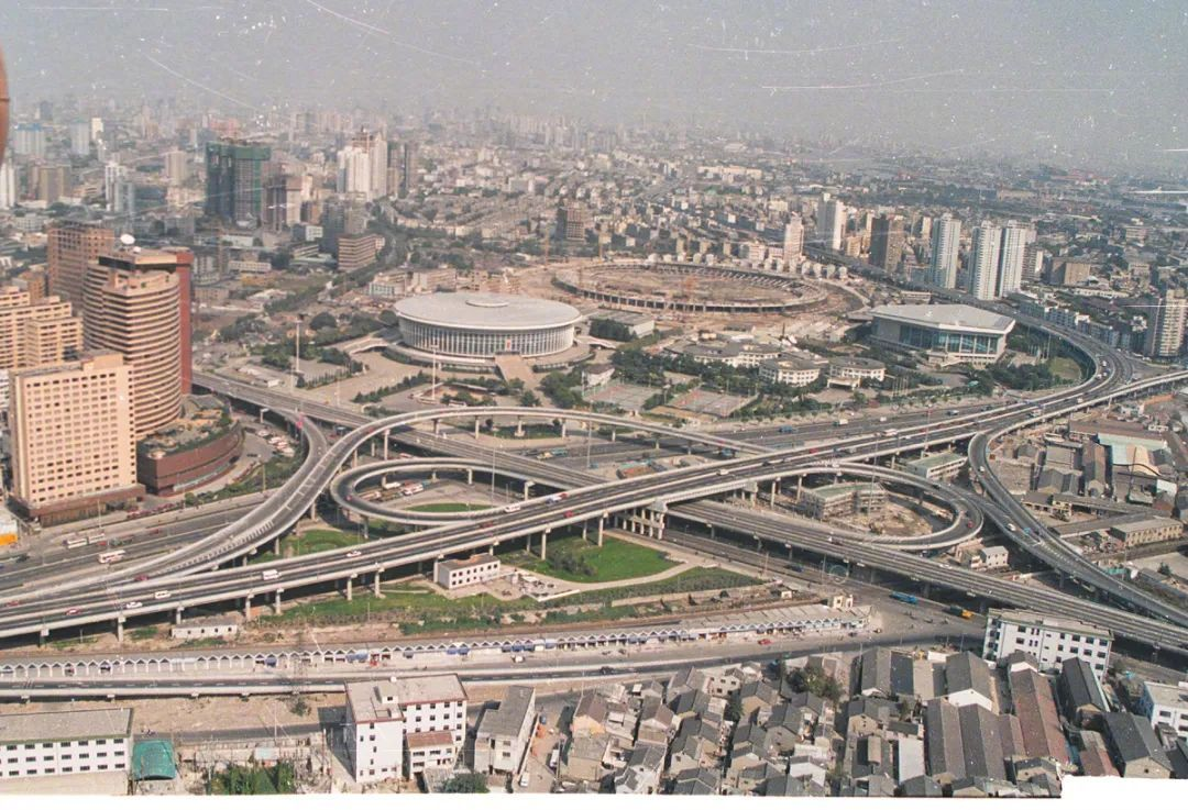 网上找到一张1994年全线通车后不久,航拍的内环线高架漕溪路立交全貌图。可以看到最左侧的就是华亭宾馆,中间圆形建筑是1975年建成的万体馆(现名是上海大舞台),右侧的椭圆形空地是刚破土动工不久的上海八万人体育场,工程从1994年9月3日开工打桩,到1997年9月竣工。