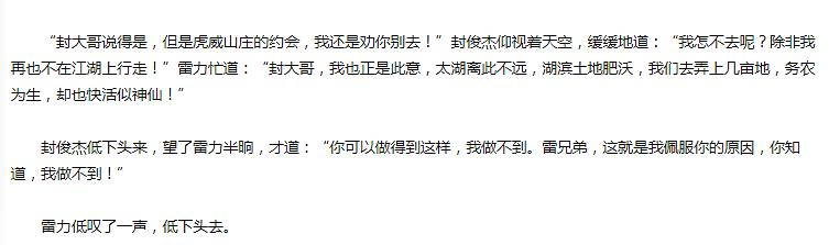 封大哥许了太湖之约,继续对雷力说:“别低着头,也不是每个人都有武功的,不会武功的人,日子只会过的更快活。”