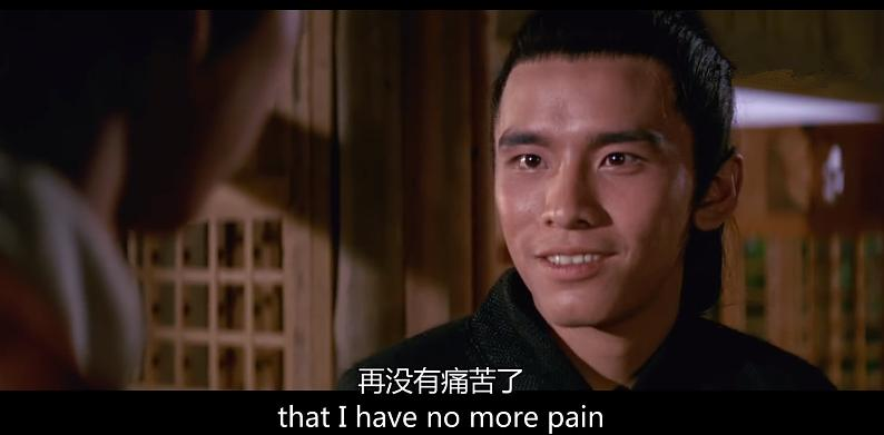 原著里他是报了姓名。扶危救困是好汉本色,可是刚成名的年轻侠士,难道不想看看对手听闻自己大名两腿一软的样子?很明显,电影里封俊杰没兴趣,他所救助的只是弱者本身,与自己的名声没关系;就像他钦慕雷力,所钦慕的也是雷力本人,与他是盛名还是落魄也没有关系;最终他不顾雷力劝阻,仍去虎威山庄为不认识的镖局讨回公道,观众也很能理解——是的,这与他自己仍没关系。这种“没关系”,让人一点点看到封俊杰的真挚和美好,只有这样纯粹的人才挽救得了雷力的心。雷力也第一次明白了,很多事情其实是无所谓的,被打败无所谓,失去手臂无所谓……他真正的“坦然”了。