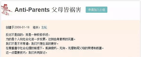 最初加入小组的只有寥寥数百人,都是80后;到后来,逐渐壮大到超过12万名成员。他们的宗旨是:“在尊重社会伦理的前提下,抵御腐朽、无知、无理取闹父母的束缚和戕害”。