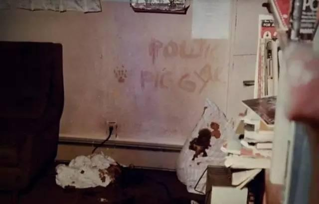 莎朗·泰特身中16刀,连同肚子里的孩子一起死于失血过多。屋子里没有丢失任何东西,门上有凶手留下的一个字:“猪”,是用莎朗·塔特的血写成的。