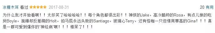 “为什么我才开始看啊!!太好笑了哈哈哈哈!!每个角色都很出彩!!神烦的Jake,高冷酷帅的Rosa,有点儿娘的吃货Boyle,面瘫却反差萌的Holt,拍马屁永远失败的Santiago,玻璃心Terry,还有怪咖一只但情商赛高的Gina!!!真是一群可爱到爆炸的“神经病”啊!!!棒呆了!!!”