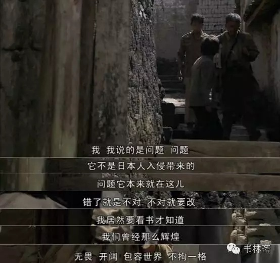 剧里有一个学生,他在找到龙文章时说了这样一段话:「……你只说打仗,你们军人就只说打仗。可我说的是问题,问题!问题不是日军入侵带进来的,它本来就在这。有问题,就是事情出错啦。错啦你知道吗?就是不对。不对就要改……我居然要看书才知道,原来我不信过的好多东西都是真的,原来我们以前真的那么辉煌,开阔,骄傲,无畏,不拘一格,包容世界。」n
