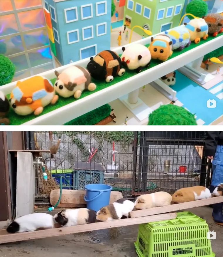 将天竺鼠与汽车结合既可爱爆表又充满想象力,这样的灵感除了来自自家宠物,其实也可能源于日本动物园的一个节目“豚鼠大行进”。为了要清理天竺鼠们的窝,饲养员会架上一个桥,豚鼠们便在上面排成一个队列行进前往别处,神似第一集中的大堵车。