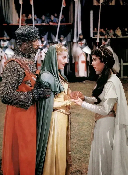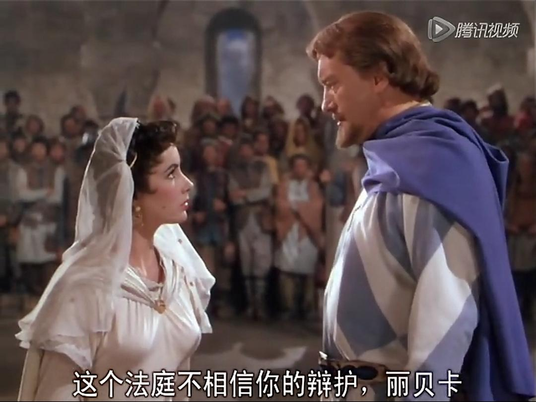 信仰基督教的诺曼人、盎格鲁人与信仰犹太教的犹太人之间有很深的仇恨与隔膜,正像艾凡赫所说“犹太民族没有家更没有国”,那个时候犹太人只求英格兰国王保证每个人都会得到公平的对待足已。这点倒是和基督教的观点一致。但是艾凡赫却超越这些宗教界限,一视同仁。正是有如此坦荡的胸怀,让丽贝尔见到他后很快就深深的爱上了他。不怕不识货,就怕货比货,人也是一样的,骑士是这样,美女也是这样的,琼·芳登饰演的萨克逊公主罗伊娜是个美人,颇有公主范,面对诺曼骑士的咄咄逼人毫不畏惧,针锋相对。但是伊丽莎白·泰勒饰演的犹太姑娘丽贝卡一出场就让人惊艳,泰勒将犹太姑娘的羞涩、神秘、坚韧表现得淋漓尽致。