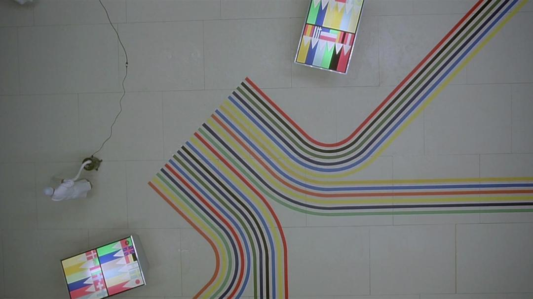 然后给了一个画面简单的俯视镜头,但信息量很大,在他们压过地上的电线后,电线被压断了,这既是急切的一个说明,同时也是对后面卡桑德拉大桥的暗示,它会因为这三个人的闯入而最终断裂,导演已经在这里给出了答案。然后注意他们在推到分岔时停顿了一下,这个细节给得很好,说明恐怖分子对这里还不够熟悉,也暗示了后面的一系列失败。展示台和地面的引导线上各种红黄蓝绿黑的颜色也互衬得很好,表达了一种不确定性。而清洁员的安排入镜和机器轰鸣声则交代了工作时间。