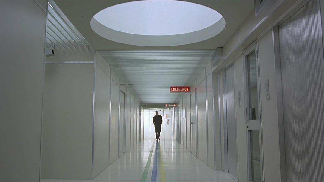 这种长方形监视窗是一个透视窗口,麦肯齐上校是最顶层的指挥,他隐匿于部分的黑暗之中,对前面的一切掌握着最主要的控制权,用看不见的手决定着这些人的生死,旁边的助手位于画面边缘,处于中立和被利用的地位,隔离间内是医生和病人,这种看与被看的关系链和接下来官员操纵医生,医生控制病人的关系对应。但医生也不过是他们的一个棋子,和病人一样被暴露在被观察和监视的高光环境下,一样逃脱不了被安排的命运,于是这也就是接下来电影所要讲的故事了,而对这种观察方式的本身展示同时也构成了对此的讽刺。其所指也没有那么简单,和前面刚出现过的IHO大楼的石碑样,其道德和政治satire可想而知,当然,这也是一种电影视觉上的对应。