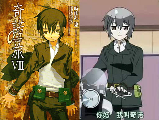 (在最初的版本里,奇诺的造型像个小男孩,不过小说封面仔细一看,还是可以看到胸部曲线的)