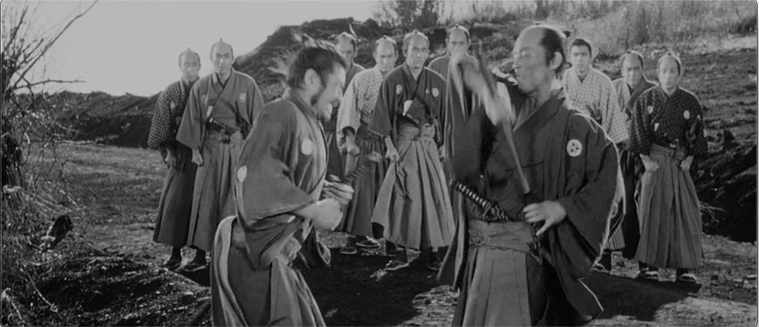 这一切在武士们眼里都难以理解,其实这就是年轻的无知和中年的睿智。日本男孩在青春期往往最容易崇拜的就是勇敢、忠诚、尊严的武士,为此常常在头上或者身上绑上一条带子,上书“侍魂”二字,极端分子还真会去为了“主人”而死,这种传统武士道的观念根深蒂固。黑泽明是个剑客,也是个武士,但他没有停留于表象形式,而是看破了那些封建的腐骨,《椿三十郎》中他让武士去光明正大的要钱,摆明了是说那些陈旧而缺乏诚意的东西还没有金钱来的实际,无疑是给残旧观念的痛心一击。