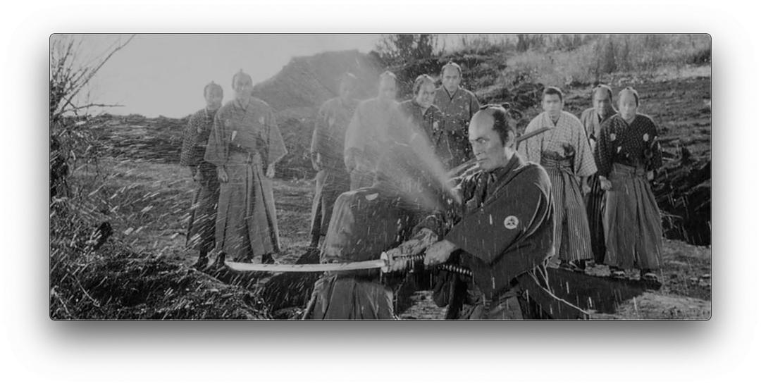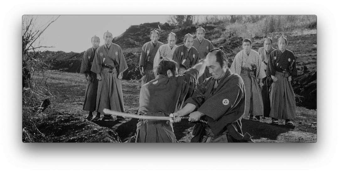 黑澤明「椿三十郎(台譯:大劍客;中譯:穿心劍)」太有名了,即使不是日本時代武俠劇的影迷,只要一般入門影迷大都看過。就算沒看過電影,至少也聽說過劇終末尾三船敏郎與仲代達矢那場壯絕的經典決鬥。