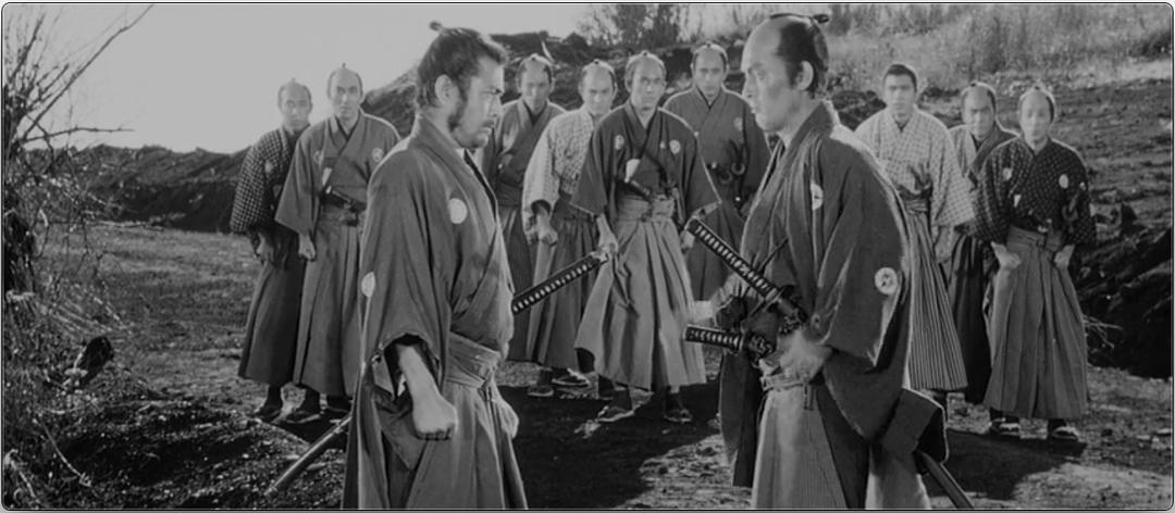 最後,椿三十郎(三船敏郎)與室戶半兵衛(仲代達矢)在郊外碰面。兩人交談畢,也談好條件(室戶答應若戰勝絕不追殺這批年輕武士),三十郎同意決鬥,兩人開始將雙手放下伸出袖外。我特別予以計時,從雙手伸出袖外到定位、對峙、緊繃、到室戶發動拔刀那一瞬間止,總共用了23至24秒。