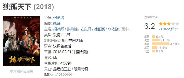 这些争议都严重影响了《独孤天下》的口碑,目前在豆瓣仅有6.8分。