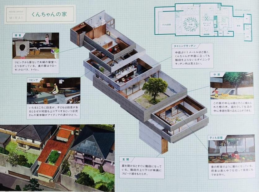 细田先生对斜坡有着格外的偏爱。在《穿越时空的少女》《夏日大作战》《怪物之子》《狼的孩子雨和雪》里都有一个或几个很大的斜坡。长长的斜坡包含着速度和活力的隐喻,也总是伴随着时空的转换。可是出于安全性的考量,总不能让四岁的小朋友像真琴那样从斜坡上一跃而下吧?于是,谷尻诚在有许多坡地的横滨设计了一座依地就势高差错落的中庭式住宅。