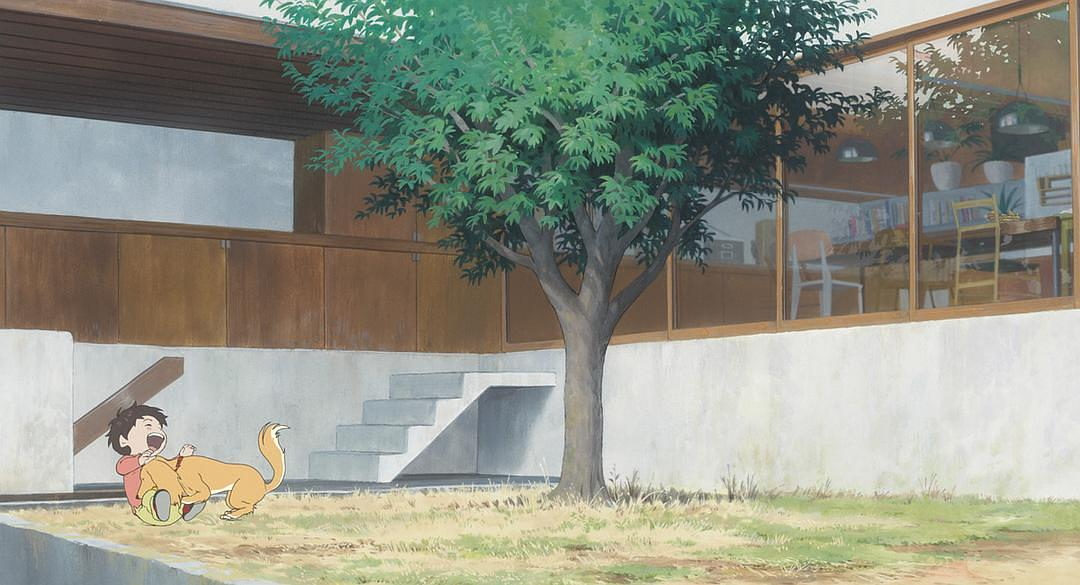 小训一家也设计了遮风挡雨的玻璃落地窗,但相比起住吉的长屋这样棱角分明的箱子型混凝土建筑可柔和多了。片头曲后第一个镜头,也和玻璃有关,小训透过玻璃窗户看着下着冷雨的室外世界,在等待迎接妹妹的到来时,无聊地在玻璃窗上呼气。玻璃是整部电影最重要的道具之一。因为房子的结构,庭院两侧的室内空间,皆被落地玻璃窗相隔。因为小训每次进行“穿越”都在庭院的木棉树前进行,所以无可避免地会拍摄到玻璃窗,因此细田守也在玻璃窗上做了一些有趣的演出。