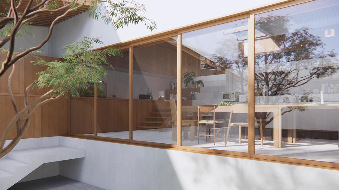 在这幢房子里,奇特基于视觉,而舒适来源于体验。向内极致亲密,向外绝对私密。外:建筑四周环境与邻近土地相连接。由于和邻近的住户距离非常近,在基地中央设置庭院,房间配置成将中庭围起来一般。临街一侧,由入口通往庭院长而高的楼梯与预制混凝土遮阳结构,形成了物理屏障,让建筑能够不受到周围视线的干扰,创造舒适、令人心安的居住环境。