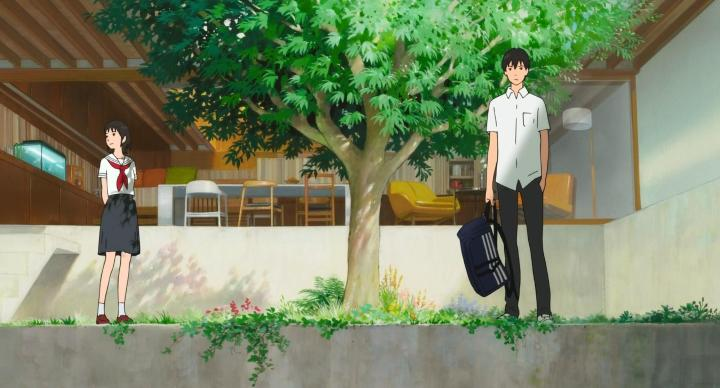 全片第一个镜头,便是被留在家中的小训透过儿童活动室的窗户看向阴雨蒙蒙的外界,对外界陌生的他即将迎来了一个“入侵者”,这便是初至人间的妹妹未来。此后,他开始因父母偏袒未来忽略自己而产生了嫉妒感,当作是外部来的入侵者。虽说如此,但实际上小训和未来的立场是对调的,父母本来就一直将未来当作家庭成员之一,小训则成了不合群者,他变得无法融入这个内部空间,就像忘了时间的钟,于是他在空间内开始了关于时间的旅程,未来与过去来回交接,直到寻回自己的时间为止。小训学会承认未来是自己的妹妹,并在家族关系中确定自己的容身之处,成了故事的暗线。细田守利用了孩童无法独自外出的原因,将他从头到尾几乎都“困”在了这个拥有奇妙设计的内部空间中。除了包括上学和学骑自行车在内的几次外出,这个过程全都在这个内部空间完成,包括小训走入过去与未来的幻想世界都是由中空庭院中的木棉树引起的。主创班底如此设计这样一个构造奇特的房子,并且作为故事主要舞台,可见,自有其影像功能所在。