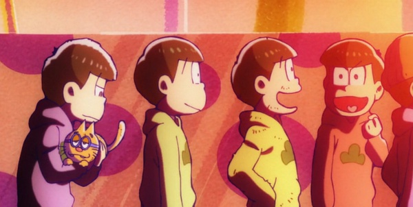 比起腐,《阿松》其实打得是感情牌,人物塑造非常成功。一开始,我们会觉得六胞胎个个废柴,20多岁还要挤在一间房里啃老。长男おそ松没担当,心理年龄只有小学六年级。二男カラ松没存在感,自我感觉良好,发言让人大叫痛い。三男チョロ松最普通,专门负责吐槽。四男一松孤僻话少,重度猫控,看上去阴暗反社会。五男十四松是个头脑简单四肢发达,成天傻笑的笨蛋。六男トド松女子力强,腹黑且懂得讨人喜欢。