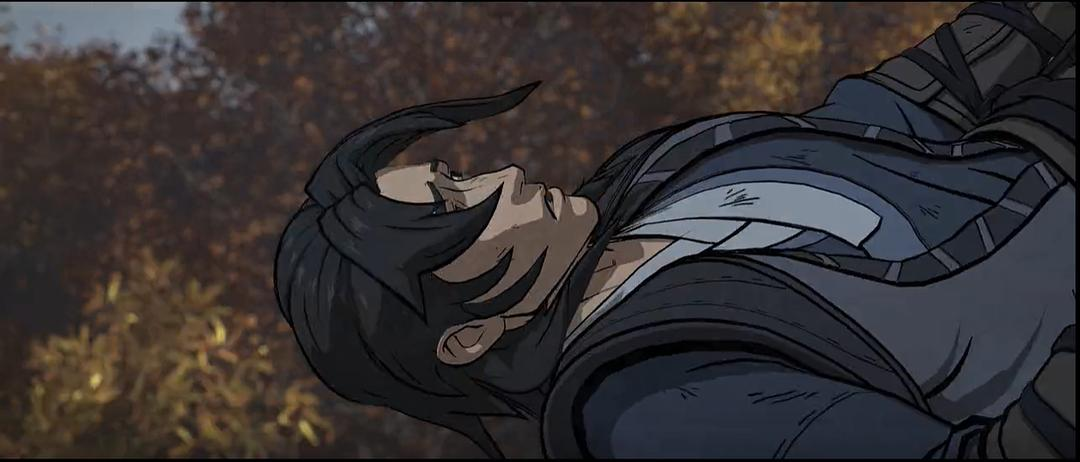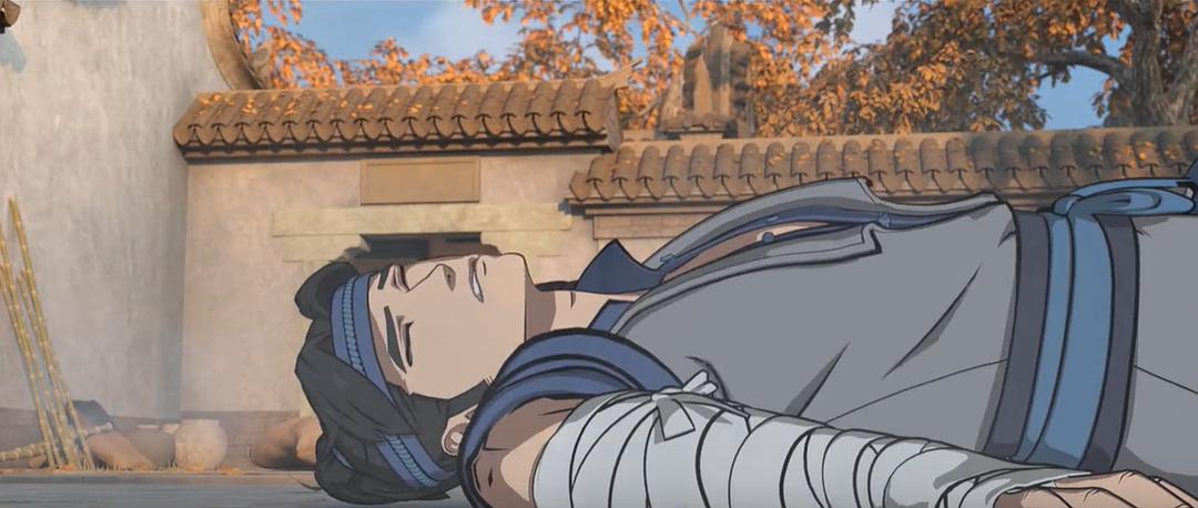3渲2的画面风格依旧,线条简洁我觉得很舒服。动作设计不必说,依然流畅。背景画面非常细致,精美逼真,光线变化也是几可乱真。颜色和天气烘托气氛很直接,金黄色的落叶林太温馨了。音乐配合很妙,最终战里似乎听到唢呐声,有几分悲壮感。有几位配音据说是港片配音,稍微有点腔调还挺有意思的,尤其西门仁说话都有点唱戏味儿哈哈哈。镜头转场有几处颇为巧妙,借助天空或者湖水、通过树叶飘落切入插叙,虽然不是什么大创新但起码顺畅,其中印象最深的是这里,罗通被龙顺打了一拳飞出去,直接连接到了年幼何父亲学拳法的回忆: