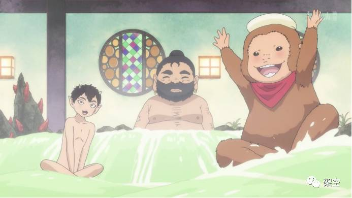 还有鬼灯和他的手下参观阎王家的时候,见到阎王的大浴室欢快地玩了起来,这里的画面也是在恶搞吉卜力,指的《千与千寻》里的“油屋”浴场。