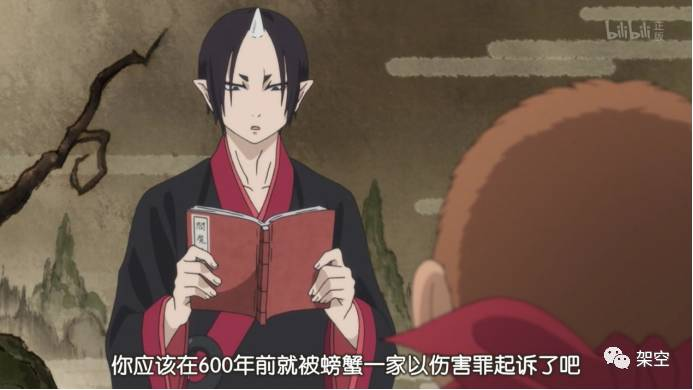 在桃太郎带着三个手下找鬼灯挑衅时,还穿插了其他典故梗,猴子的设定与《猴蟹大战》结合在一起。《猴蟹大战》也同样是日本童话名篇,故事有两个版本,不论哪一种,猴子的形象都是奸诈贪婪,惹恼了螃蟹,最终屁股被夹成了红色。