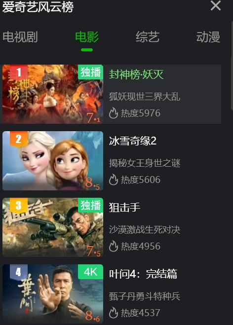 截至完稿,《封神榜·妖灭》在爱奇艺平台的热度为5976,位居电影榜单第1名,击败迪士尼动画大片《冰雪奇缘2》。