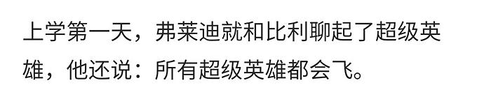 面对Freddy午餐时的无聊问题,隐身和飞行两个超能力你会选哪个,Billy敷衍地选了隐身。Freddy回答,你选隐身这个技能是因为,你根本不相信自己能成为超级英雄。