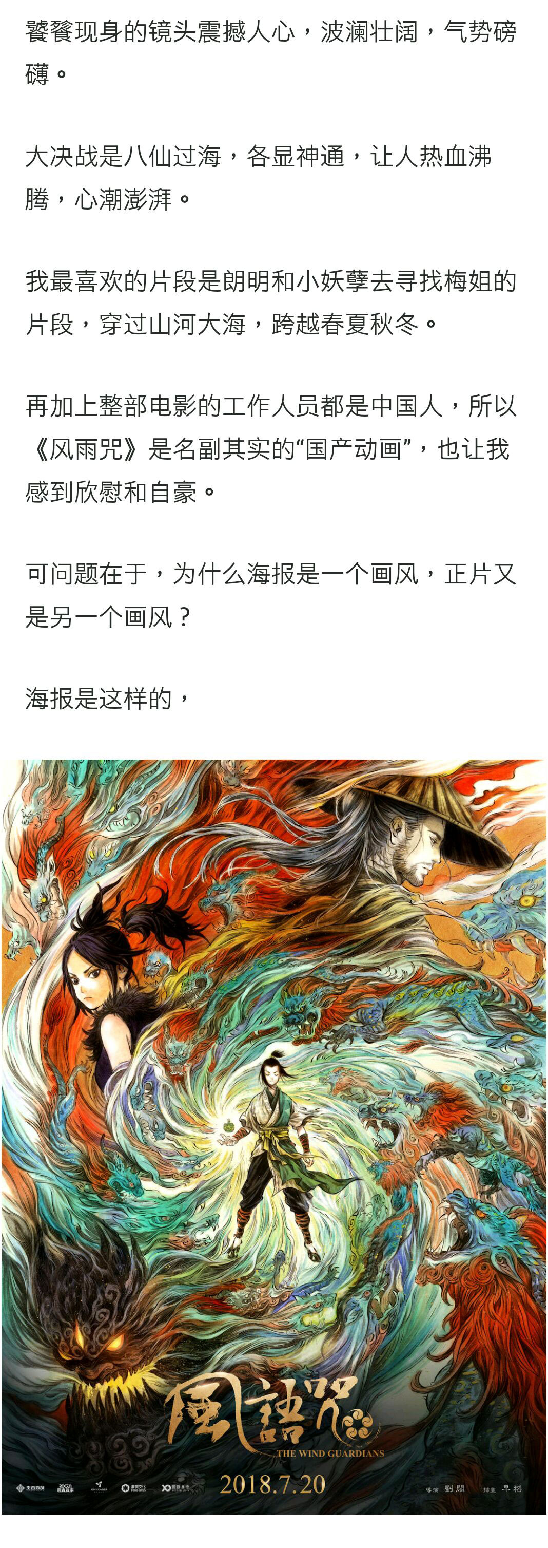 片尾我再次留意了制作公司,除了项目统筹若森数字以外,外包的制作公司有20多家,因而难免出现pipeline上和技术上的不协调。外包量比重过大,项目管理困难,我认为是造成本片CG工艺上瑕疵的主要原因。其实若森数字从画江湖不良人开始,他们从技术上并不是最顶尖的。也因为番剧需要跑量,可能使得他们对制作精细程度上的追求有些不足。剧作不成熟,准备不充分,匆匆制作上院线,我个人感受到的不是国漫崛起,而是好高骛远和经济效益。