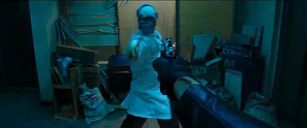 首先就是对打斗场景的展示,包括第一场戏仿《硬核亨利》的第一人称动作段落。很聪明的一点是,导演非常明白这种动作戏的尝试不能一条路走到黑,否则就成了copy cat了,并且脱离的方式非常令人惊喜——女主被抓着头撞向墙上的镜子(这是整容前女主的脸首次出场)然后镜头回拉,发现已经从第一人称转为旁观视角了,这个衔接非常流畅自然,还跟动作本身形成了互动。这里唯一的缺点就是,当第一人称视角无法体现的动作正在进行的时候会产生短暂的错愕感。最明显的就是女主被人从身后抱着往后拖的时候,镜头持续了1,2秒观众才反应过来可能是怎么回事。这个缺点其实是这种拍摄方式无法避免的,因为电影始终是视听艺术,没有肢体接触,也就是说主角能感觉到被人拽着走,我们却只能靠看到的内容来猜。另外有一个值得留意和吐槽的地方:开场这段戏女主换弹夹的动作,是非常明显的为了展示给观众看才那么做的动作,而且对比最后一场枪战戏女主同一个换弹夹的动作就跟前面这里完全不一样。这其实是动作设计上的一个明显的纰漏。