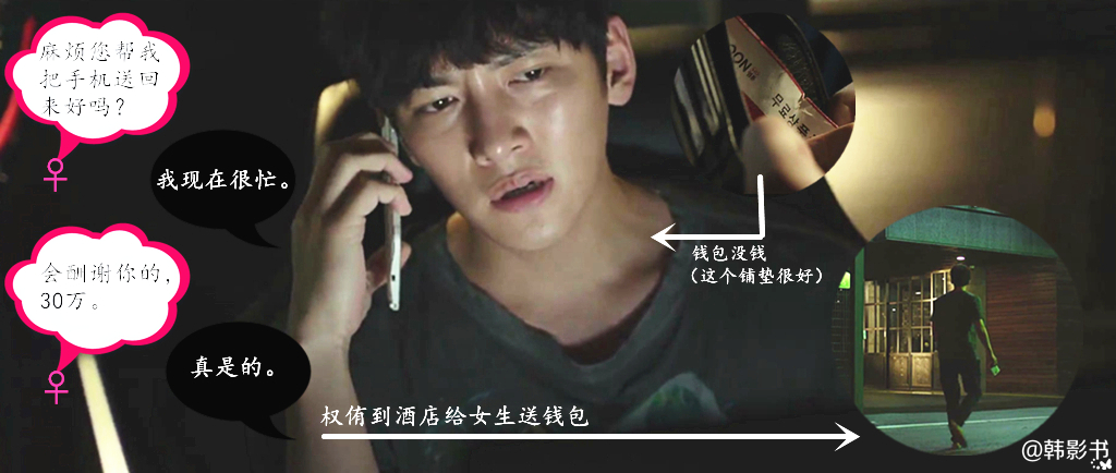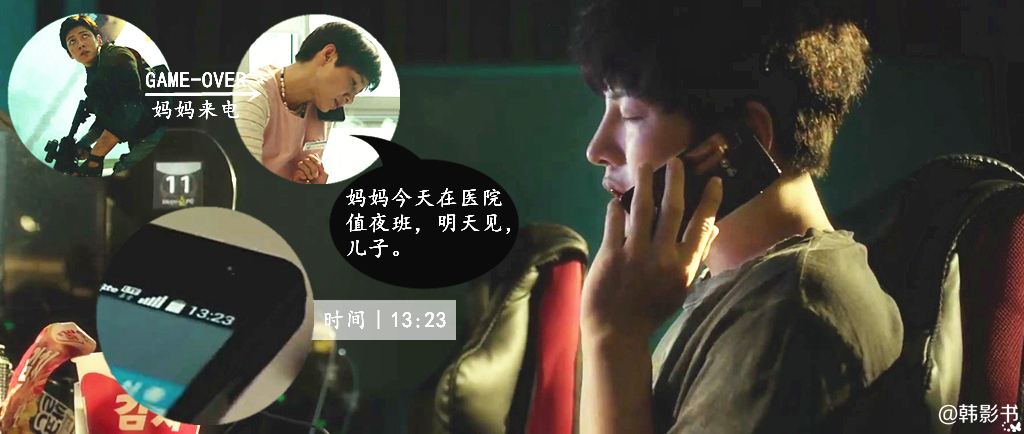 03︱权侑没有听妈妈的话回家去关煤气,而是继续留下来玩游戏。等他看到隔壁座位落下的电话时,已是天黑。囊中羞涩的他,没能抵挡30万韩元的报酬诱惑,前去给女生送电话。