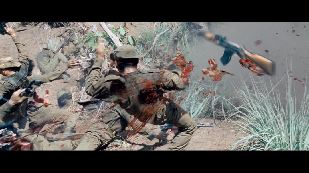 片中蓝博兄弟没有那么爱脱衣服了,但是杀气却似乎历老弥笃、更见凌厉了。影片中暴力场景之血腥,几乎达到了R级标签的底线。想必不少影迷已经从预告片中,见识到了蓝博用重型机关炮近距离将敌人轰成肉酱的镜头,这样的场景几乎充斥影片中所有的战斗场景。所有的子弹,几乎都是穿胸而过,带出一大片血花;又或者是一枪爆头,不留下一两片耳朵。不要怪人家故意夸张,这和片中选用的武器有关。其中最没威力的AK-47变种系列,比起美制M-16来,爆头系数也要高得多,其他更不用提迫击炮、地雷、高爆炸弹、重机枪的威力了。甚至连本来该是“羞答答的死神静悄悄地来”般效果的狙击枪,也用上了反器材用的.50口径M82A1,人家薄一点的坦克都能打穿,用来射人还不是分分钟把人打得穿个大洞还连带着在惯性作用下飞出老远?即使是最老土的徒手格斗,生猛的蓝博还硬生生地撕下敌人一片肉来……至于是哪片肉,俺不会说的,反正不是男人“最要紧”的那块肉,嘿嘿~~