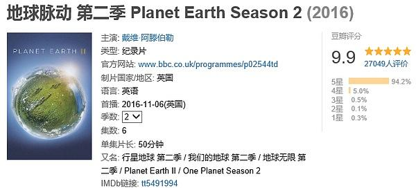 他们很有可能是恶意打一星,因为之前是10分,他们打一星之后就降为了9.9,他们觉得自己很牛逼。然而这能撼动《地球脉动2》的豆瓣评分第一的地位吗?