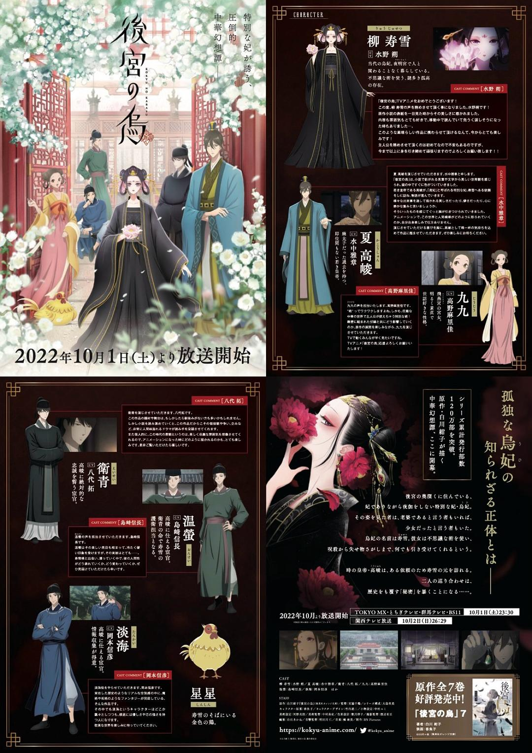 《後宮の烏》是一部轻改动画,2021年12月14日宣布动画化,由万代南梦宫影视BN Pictures负责制作,于2022年10月1日起播出。原作小说作者是白川紺子、香魚子负责插画,发表于集英社Orange文库,2018年开始连载至2022年4月完结,共出版了7卷,累积销量约120万册。