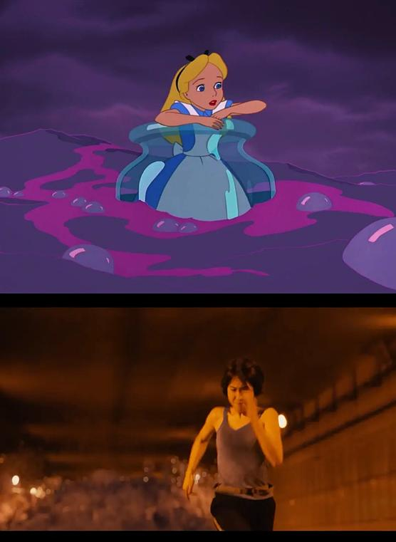 7.剧中的第四集,奔跑的游戏,最后终点其实在起点,致敬的仙境里面红皇后那句著名的“只有不断奔跑才能待在原地”。该语句其实出自 《爱丽丝梦游仙境 》的姊妹篇 《镜中奇遇记》。另外《仙境》中爱丽丝变小后被自己的眼泪洪水冲到仙境,这段特写在剧中第四集地下通道涌出的涛涛洪水有致敬,然后《仙境》中爱丽丝和伙伴(鹦鹉,小鹰,鸭子,渡渡鸟)上岸后为了弄干衣服,举办了一次随性赛跑,可以任何时间跑,任何时间结束,没有终点,然后所有人都是赢家。剧中的赛跑规则有点类似,而且也是5人,只是终点在起点。《仙境》中描述的赛道是一个圆,所以终点也是起点。(卡通片中该情节省去)