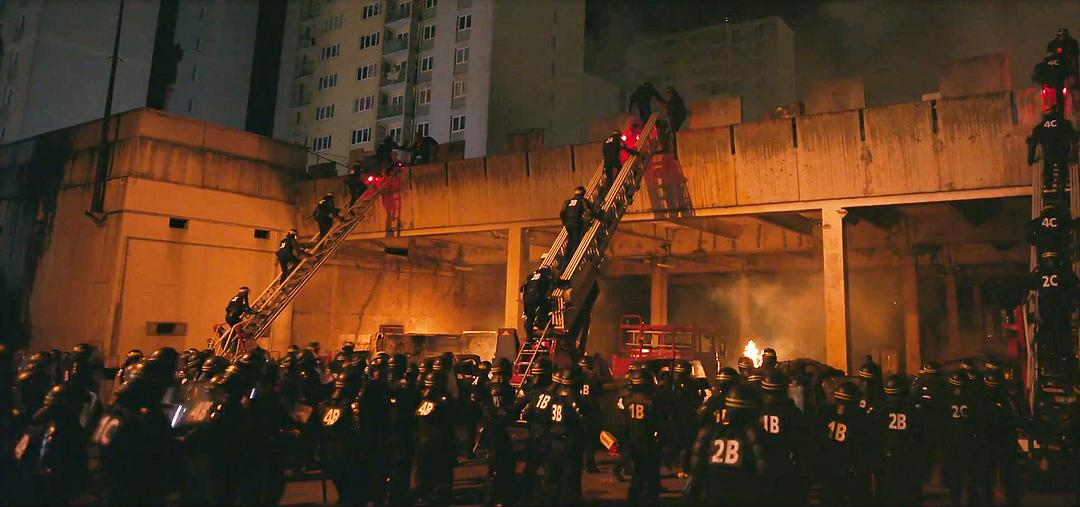 《雅典娜》和《悲惨世界》渊源颇深,两部电影的主创有诸多重合,从拍摄手法来看,《雅典娜》也堪称《悲惨世界》的升级版。《悲惨世界》将大量篇幅用来剖析法国社会阶层的分裂,而《雅典娜》完全舍弃了文戏,从影片第一个镜头开始,就是一段炫技的长镜头,寥寥几笔简述了起因,紧接着就是一段疯狂的城市暴动——愤怒的移民用燃烧瓶点燃了警局,暴动的城市成为了追逐戏的背景板,街垒、防爆盾牌、燃烧的车辆、弥漫的硝烟……这是一场没有重武器参与的城市巷战。