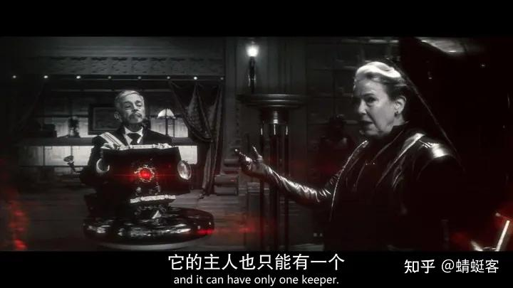 埃尔莎得到了血石,电影变成了彩色的,这时我们得知埃尔莎穿的是红色的衣服,说明从一开始她就注定会得到血石。