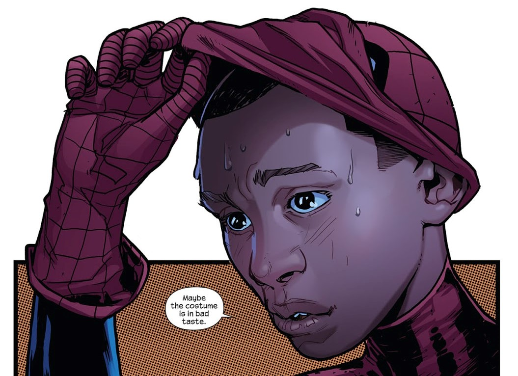 n刚出道的迈尔斯由于身穿廉价的蜘蛛侠cos服装,常被路人吐槽衣着品味糟糕。