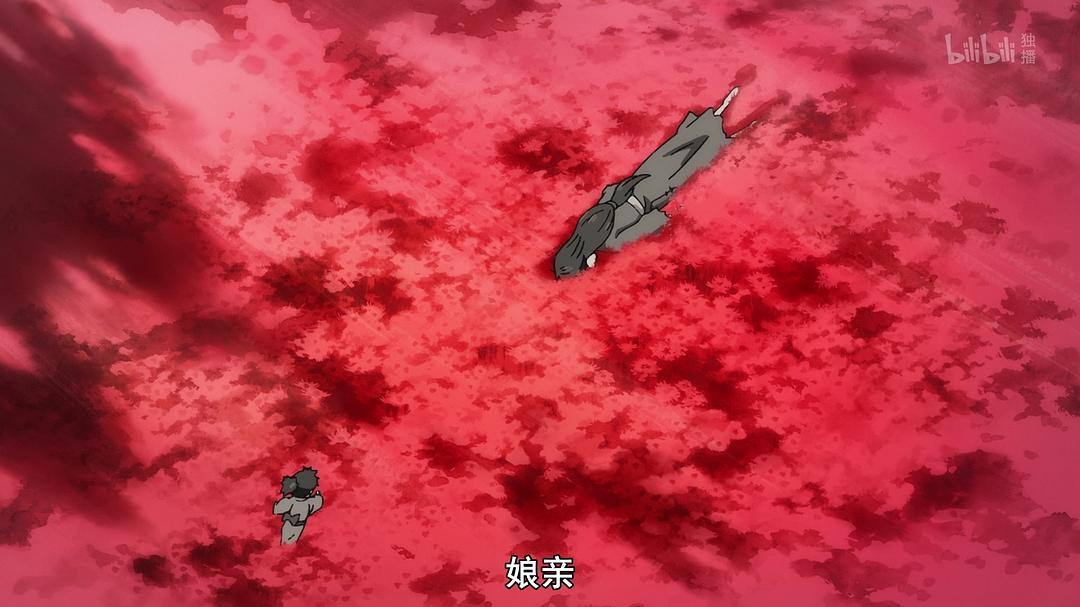 后面二当家果然为了欲望叛变了,山寨全军覆没,剩下的人跟着二当家一起当了走狗,而多罗罗的父亲大当家腿部伤势严重,一家三口彻底变成了流浪汉,此时,回忆中的彼岸花首次登场,红色的彼岸花颜色较暗,安静祥和,没有侵略性,也象征着一家三口占时较为安全,而后面逐渐凋零的彼岸花则表示着,下一幕的死亡即将到来