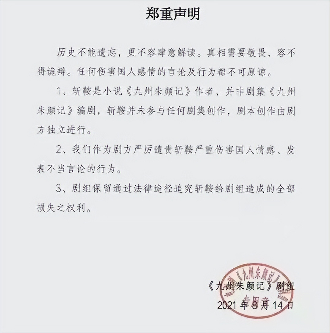 这场闹剧最终以斩鞍被禁言告终,《星河长明》剧方赶紧撇清关系,表示斩鞍没有参与到剧集制作中。
