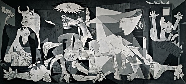色彩的缺失给整幅画平添了震撼之感,画面上满是痛苦不堪、厉声尖叫、濒临死亡的人和动物,毕加索利用这幅画表现了西班牙人民所遭受的惨痛经历,他同时也在回应一种新型的暴力:仅仅是指点江山就能谋杀整座城市里的人。
