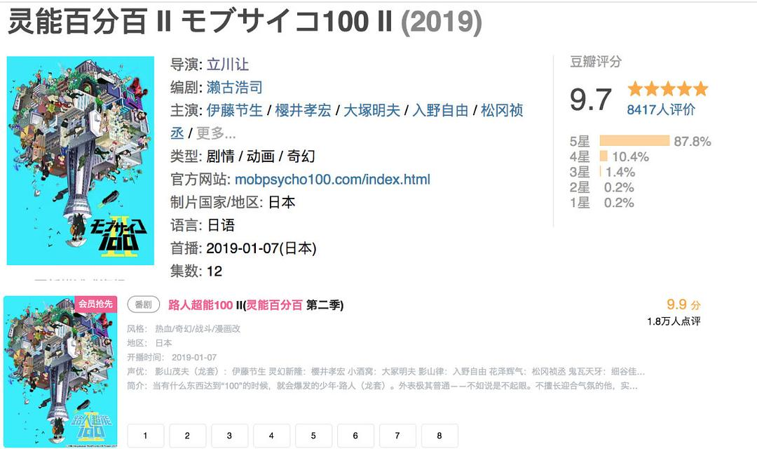 目前播出8集(总共12集),豆瓣评分飙到9.7,在B站(bilibili)上的评分则是直接登了顶(9.9)。
