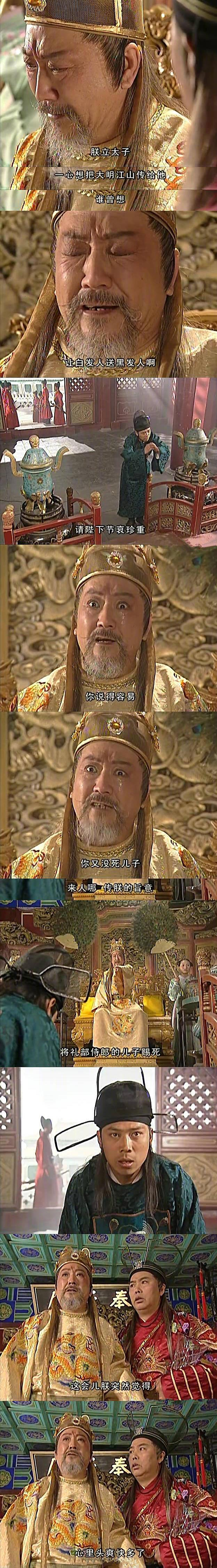 马皇后演得也非常好。对剧雪的印象是蔡文姬,好美好端庄。剧中的马皇后,代表了朱元璋的人性。马皇后死了,朱元璋身上也就没有什么人类的东西了,只剩下皇帝这个残酷无情的政府职能机构。可惜,可怜,可叹。