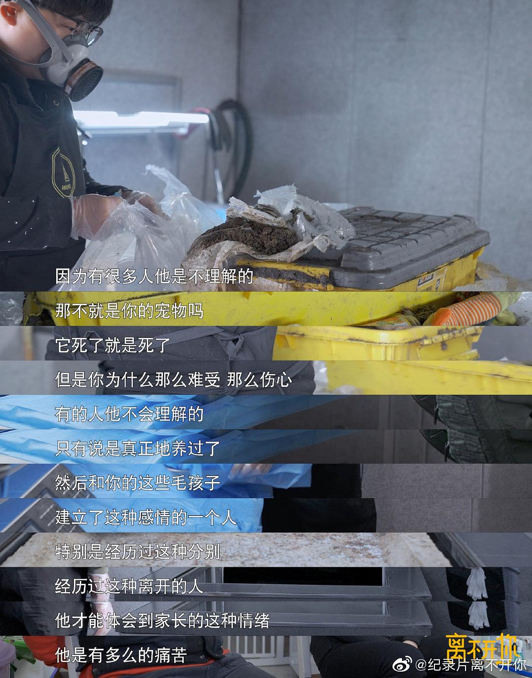 第三集讲宠物的离去,不仅采访到了默默守护爱宠离开的主人,也有宠物殡葬行业的从业者,宠物骨灰盒的设计师的视角。跟人类入殓师一样,是群温柔又坚定的人。