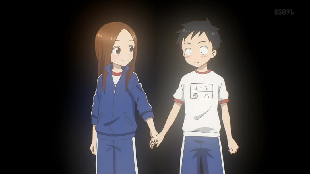 而西片,一想到直呼“高木”一想到约会都会结巴脸红的西片,第一次面对这种感情攻势,而且还是那么可爱那么受欢迎的高木同学,这怎么可能?他不知道怎么办,他只敢在内心有小小的期待,从橡皮檫上的名字,到情人节的巧克力,到篝火晚会的牵手,一开始以“她又在捉弄我了”躲避,后来慢慢的,每天想着对高木的作战计划,做惊吓盒子,做跟踪狂,跑遍商店买的特产,“难道我对高木同学....”,直到那天神庙的黄昏,高木的眼神,西片才知道自己应该怎么做,虽然又是犹豫了很久,不过还是迈出了第一步~~