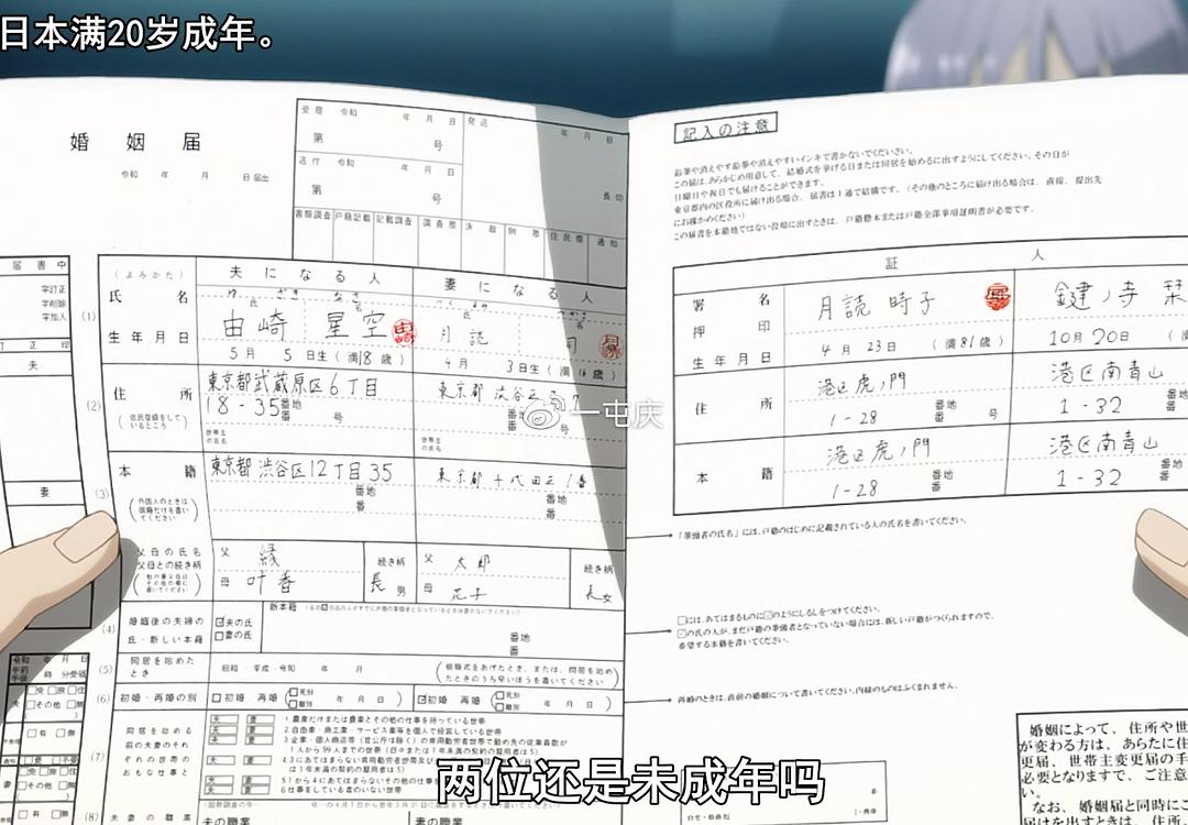 2、日本结婚的时候是需要证人的,顺便一提,只要有印章的话谁都可以当证人,就算路上随便找到的陌生人也可以,其他还需要印鉴、户口本、以及个人身份证之类的,并且结婚申请是24小时全天受理的,为的是照顾白天一直要工作的人,或是想要私下结婚的知名艺人之类的24小时婚姻登记所:两位还是未成年吗(日本满20岁成年),那么还需要监护人地同意书才行。