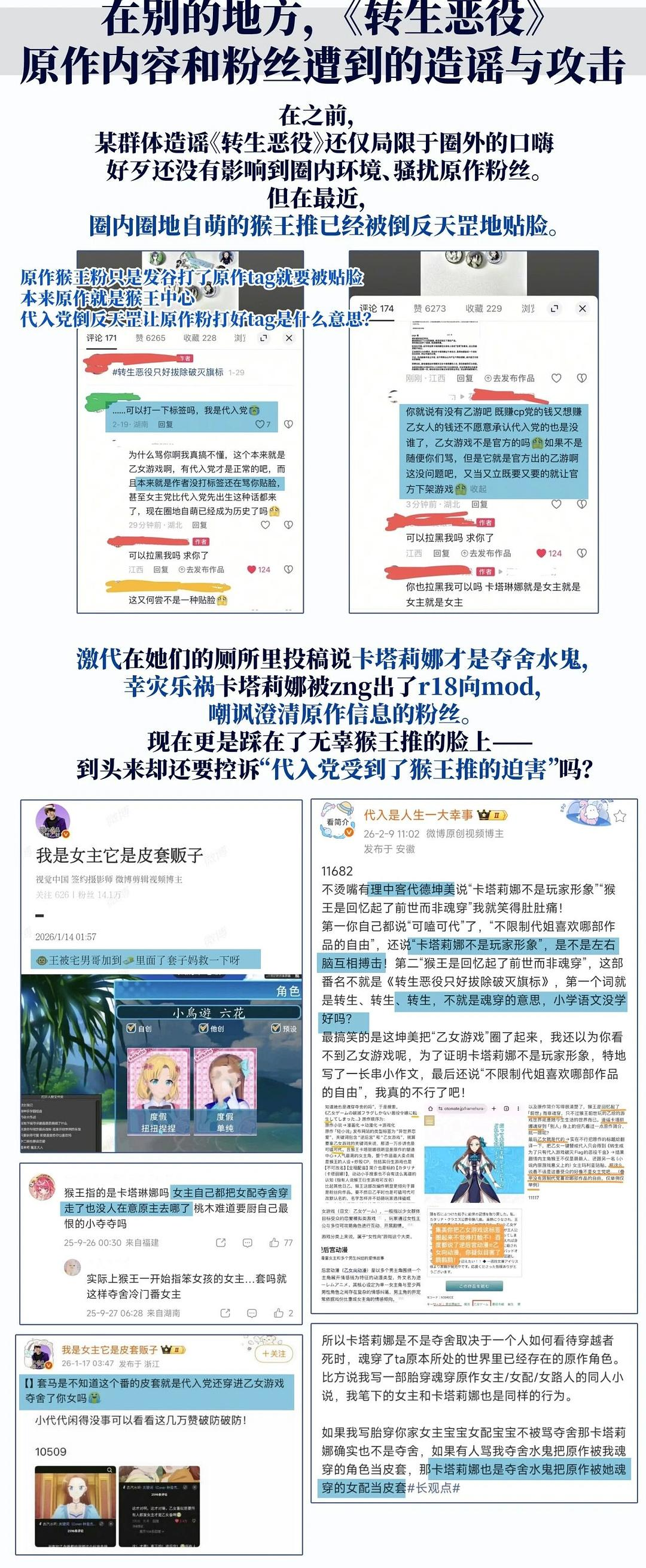看不下去《转生恶役》了。实际上从第一季后半就看不下去了。nnnnnnnn女主角就仿佛身体长大心智还未成熟。所以幼年时期很自然很可爱,随着年龄增长再看,嗯?这是活过两辈子的人?nn其他男女角色就好像工具人中了一定会对她动心的魔咒。nn且不说卡塔丽娜不是游戏原女主,原女主的光环被削弱大半这是怎么做到的很奇妙。就算她自己的性格让大家都喜欢上她,也不至于,不分男女的收割?能不能有正常的友情?nn按这个剧情继续,后期进化成一条线HE其他线BE,可能性还是挺大的吧。其他人就全是工具人不配得到幸福注定受伤害呗。nn如果把其他角色当成游戏工具人可攻略,那么工具人不会有自己的情感。nn如果把其他角色当成活生生的人,那他们又不够完整。强行被攻略,甚至未婚夫妻两个人同时喜欢她,真的正常吗,编剧在想什么,修罗场不是这么玩的啊?nn转生异世界的毛病就是“角色受到异世界影响”,比如史莱姆后期性格,谁能看出生前是个社畜大叔;以及“收割各种人物”,当然确实爽,入间也开挂一样经历了一系列事情。nn但是他妈的不是!只有!爱情!更多的是产生一种羁绊吧,亲情也好友情也好尊敬也好佩服也好仰慕也好。nn我承认卡塔丽娜有博爱大度热情等等方面优点。n难道别人没有这种优点吗,凭什么让所有人对她怀有爱情,乃至解除婚约啊?nn虽然说看这种轻松向没必要较真但我看不舒服就要骂。问就是爱之深责之切。本来第一季很期待的,给我发展成这样。毫无逻辑的爽压根看不舒服啊?nn——————n继续骂。nn首先一个跟你不熟的人,囚禁你,居然不是想得到什么,而是疑似要保护你。其次囚禁你的女仆角色,说“你果然跟传闻中”一样,说明她对你也不熟,只是传闻。n她对你不熟,你也跟她不熟,她对你还那么好。那我只能说,这是一位精通人性的女讲师。nnn然后,说亚兰到现在没找到跑道的。n凭什么要上所谓的跑道啊?不喜欢不追求也有错?