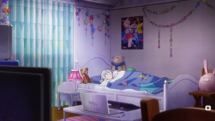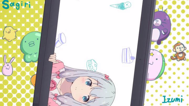 这里的媒介是原型为Wacom的数位屏,呈现出一种屏幕中有屏幕的媒介重叠演出效果,而且还使用了旋转的方式增加了调皮感。数位屏也是纱雾这个角色的象征,作为强调人物特摄非常具有代表性。