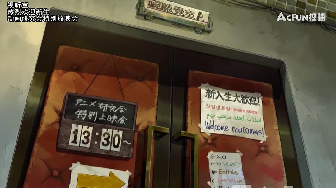 7分16秒,动画研究会的大门有日语、汉语、韩语、阿拉伯语、英语。芝浜高校是一个国际化程度非常高的学校呢。