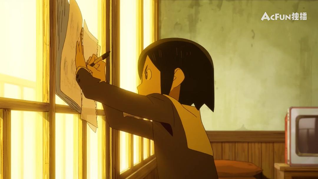 如果将第一话看作完整的单元剧,与昆汀的《好莱坞往事》类比,就会发现其中精巧的剧作结构。一是贯穿始终的“片中片”:浅草、金森、水崎三人之前的所有“排练”,都是为了最后那段天马行空的想象——从浅草的简笔动画,到《未来少年柯南》中神秘的飞行器,乃至三人摆脱黑衣人的追赶的桥段,都在“最强的世界”里得到了互文。在动画中与现实和解,永远不会被大人追上。二是有关“元动画”的思考。让我们回到动画研组织的放映会,在这个镜头中,观众的视角首次与浅草氏达成了统一。
