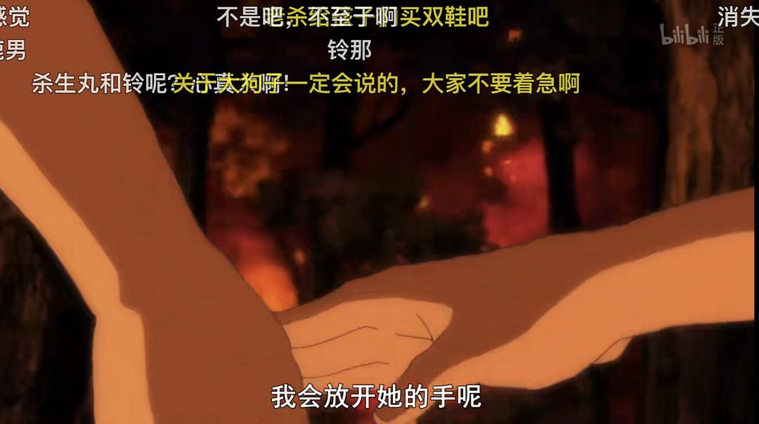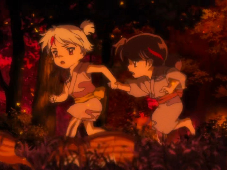 图二:本续作最核心缘起——姐姐在逃命山火途中莫名其妙放开了妹妹的手。就,真·莫名其妙·无缘无故·无人打扰·跑着跑着就放手了。我就想问这性格是遗传谁的???沉静如渊不动如山的杀殿???还是同样四五六岁见到混身鲜血面目狰狞的大妖也不会害怕走开的玲???